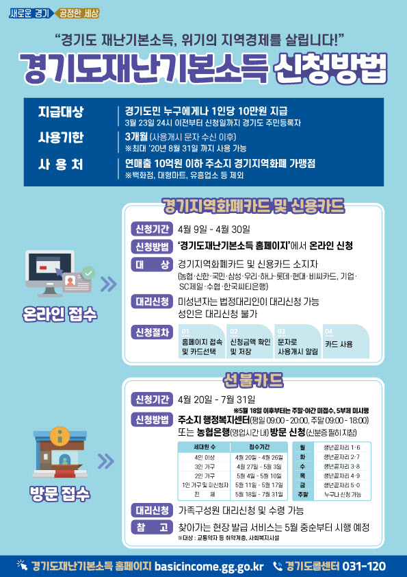 지역화폐나 신용카드 사용자는 4월 9일 열리는 ‘경기도 재난기본소득 홈페이지’에서 경기 도민임을 인증하고, 재난기본소득을 받고 싶은 자신의 지역화폐 카드나 신용카드 정보를 입력하면 된다. 지역화폐의 경우 신청일로부터 2일 이내에 승인 완료 문자와 함께 10만원이 충전 된다. 신용카드는 완료 문자가 오면 이때부터 차감이 진행된다.